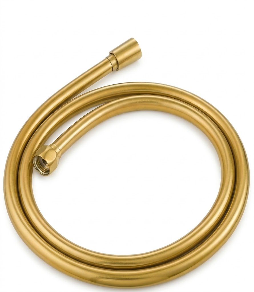 Stylish anti-twist PVC hose with high-pressure resistance. Available in 120cm, 150cm, and 200cm lengths with premium finishes (Silver, Gold, Mat Gold, Mat Black) for modern interiors.